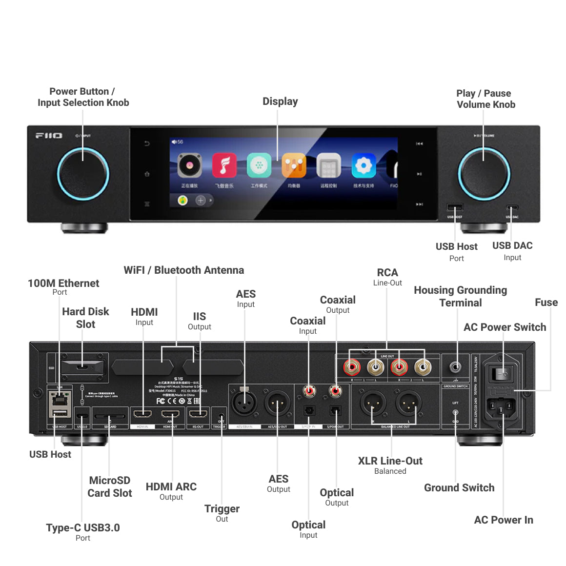 WiFi : 2.4GHz / 5GHz, Supports DLNA, AirPlay, WiFi Song Transfer, Roon Ready, etc. Bluetooth Transmission (5.0) : AAC / SBC / aptX / aptX HD / LDAC / LHDC Bluetooth Reception (5.1) : SBC / AAC / aptX / aptX LL / aptX HD / aptX Adaptive / LDAC FIIO Link : Android Supports WiFi and Bluetooth Control, iOS Supports Bluetooth Control HDMI Ecoding : Supports Audio Decoding for DVD / Set-top Box / Computer HDMI ARC : Supports Audio Decoding For Devices With ARC Function HDMI I2S : Supports Audio Decoding For Devices With I2S InputAll to DSD : Supported EQ Adjustment : 10-Band Dynamic EQ Adjustment (±12dB), Built-in 8 Preset EQ, Supports Self-Define EQ MQA : Supports Full Decoding Operating Mode : Supports Gesture Navigation, Two-Button Navigation And Three-Button Navigation Max. Supported Sampling Rate : USB DAC : Up to768kHz/32bit; DSD512 (Native) Native Decoding : Up to384kHz/32bit; DSD256 (Native) USB Audio : 768kHz/32bit; DSD512 (Supports DoP/D2P/Native) Coaxial In Decoding : Up to 192kHz/24bit AES In Decoding : Up to 192kHz/24bit Optical In Decoding : Up to 96kHz/24bit Coaxial Out : Up to 384kHz/24bit; DSD128 (D2P/DOP) AES Out : Up to 384kHz/24bit; DSD128 (D2P/DOP) Optical Out : Up to 192kHz/24bit HDMI In : Up to 192kHz/24bit HDMI Out : Up to 192kHz/24bit Bluetooth Codec Indicator (Knob Indicator Light) : Blue : SBC Cyan : AAC Purple : aptX/aptX LL Yellow : aptX HD White : LDAC Green : aptX Adaptive Orange : LHDC Cyan : SQ Yellow : HR Green : DSD Magenta : MQA Sampling rate indicator (knob indicator light) : Blue : Lossy Cyan : SQ Yellow : HR Green : DSD Magenta: MQA Screensaver : Supported Firmware Upgrade : Supports Upgrade Through Local Storage + microSD card + OTA Double Tap to Wake Up : Supported